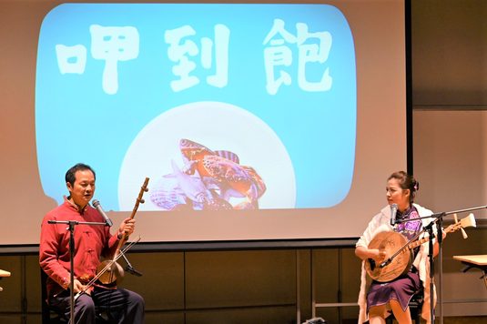 当日は、アジア学科と芸術学科の学生や教員及び近隣にお住まいの方ら約30名が参加。今回のイベントを企画したアジア学科の立石謙次准教授による紹介に続いて、儲さんが低音を奏でる大広弦と呼ばれる擦弦楽器、林さんが撥弦楽器である月琴を手に登場。さっそく「あいさつ」の演奏を披露するとともに、台湾では250年余りの歴史を持つ唸歌を構成する「三大要素」として一句七文字、四句で一篇を構成する漢詩などにも見られる「四句連」の歌詞や「歌仔」と呼ばれる曲調、月琴と大広弦の楽器について解説しました。さらに、唸歌の内容を視覚でも伝えるために制作された映像とともに「哪吒閙東海」(哪吒、東海を騒がす)を披露。儲さんの軽妙な語り口と林さんが使い分ける声音、二人の熱演に聴衆は引き込まれていました。また、1930年代に台湾が日本統治下にあった時代に歌われた、日本語と台湾語を繰り返す「新編国語白話歌」についても紹介したほか、会場から寄せられた質問にも回答し、「唸歌の芸は師匠から口伝えでのみ伝承されますが、演者はどんどん減っているのが現状です。伝統芸能を守るために上の世代の方たちからさまざまなものを学び、資料としてまとめて後世に伝えていきたい」と語りました。