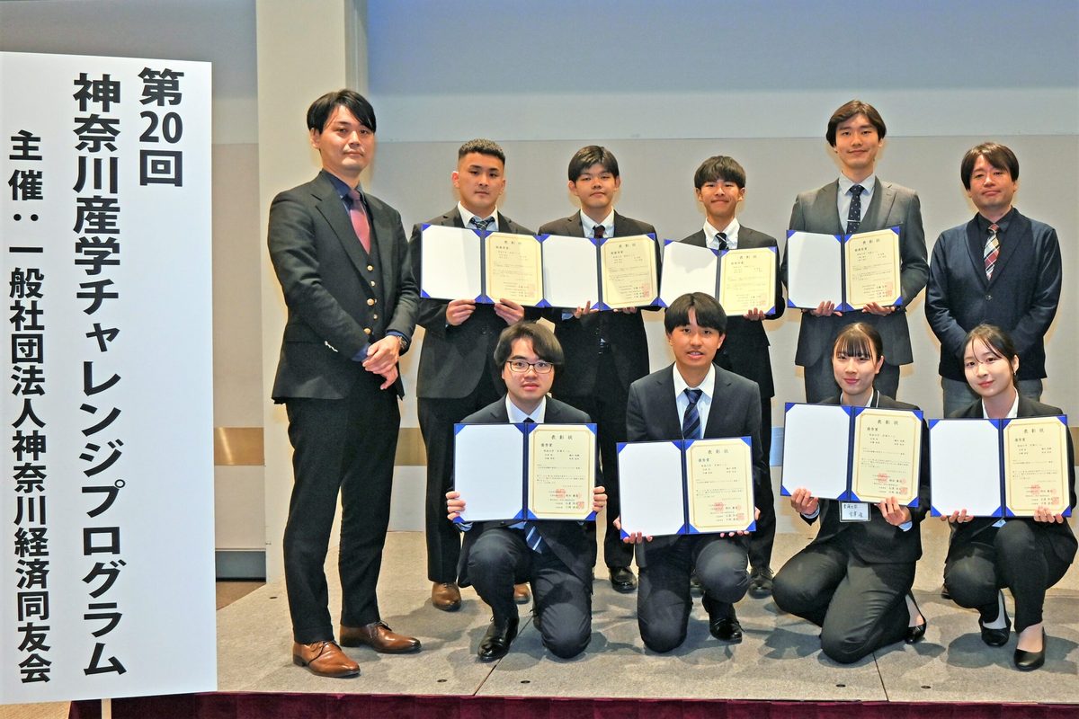 昨年12月17日に神奈川県・パシフィコ横浜アネックスホールで表彰式が行われた課題解決型研究プログラム「神奈川産学チャレンジプログラム」(主催:一般社団法人神奈川経済同友会)で入賞しました。このプログラムは、参加企業が経営課題の中から実践的な研究テーマを提示し、学生チームが約半年をかけて解決に向けて取り組んだ成果を論文にまとめるとともに、企業の担当者にプレゼンテーションするものです。今年度は18大学から204チームが参加し、最優秀賞30件、優秀賞44件が表彰されました。本学からは、文化社会学部広報メディア学科の野口将輝准教授の研究室に所属する「垣尾チーム」が最優秀賞、教養学部芸術学科3年次生の「感性コンテンツデザインラボ」(指導教員=熊谷慶助教)に所属する「宮澤チーム」が優秀賞を受賞しました。