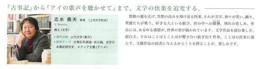 ミズモノ・シンポとは日本文学科の志水義夫先生(専門:上代文学・アニメ研究)、文芸創作学科の堀啓子先生(専門:近代日本文学・比較文学)、同じく文芸創作学科の助川幸逸郎先生(専門:源氏物語・近代日本文学)、それぞれ専門の異なる3人の研究者が、サブカルチャーと本格文学研究とを交叉させることをめざして始めたシンポジウムのことで、3人の名がいずれも「水」にかかわることから、ミズモノ・シンポと呼ばれるようになりました。すでに20年の歴史を誇る、東海大学ならではの学術イベントです。