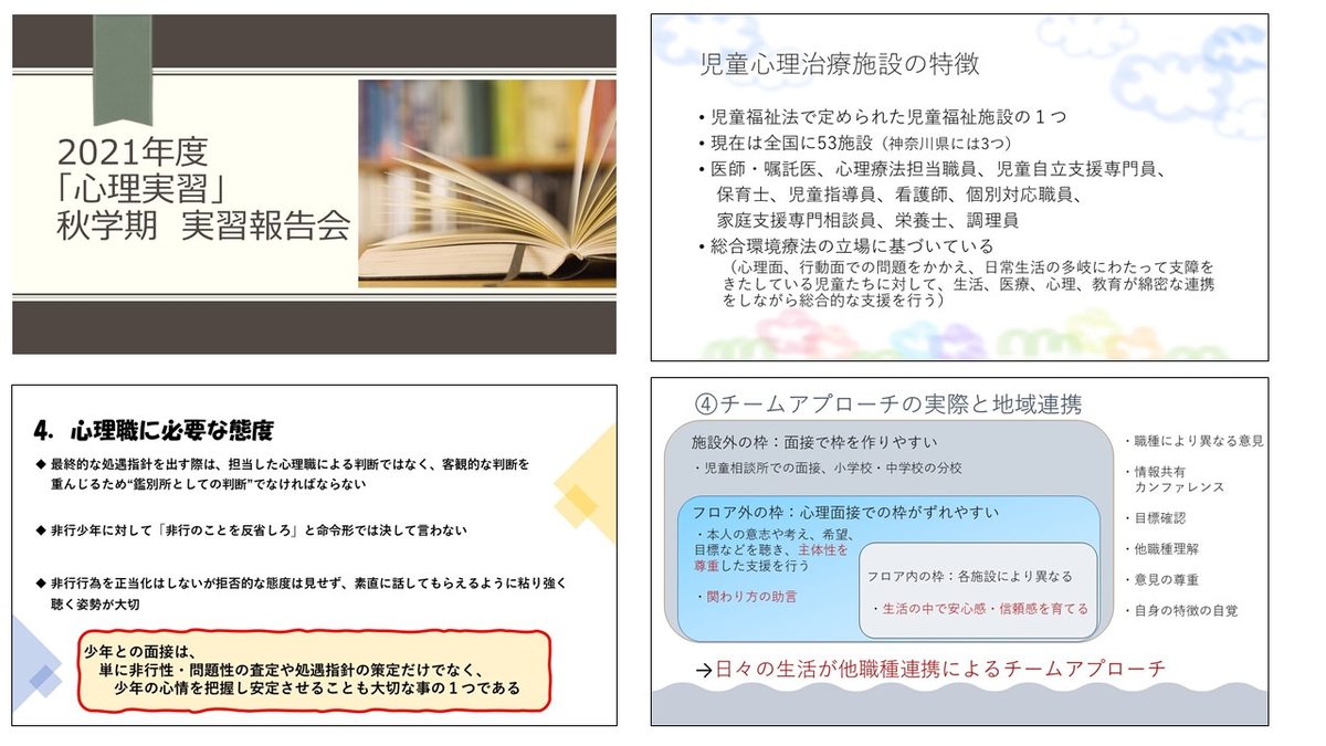 実習生は、それぞれ実習施設を分担し、これまで学んできた豊かな実践知を自分なりに咀嚼して、少しでもわかりやすく伝えられるよう準備をしてきました。春学期の実習報告会のときよりも理解や考察が深まり、実習生ひとりひとりの確かな成長が感じられました。