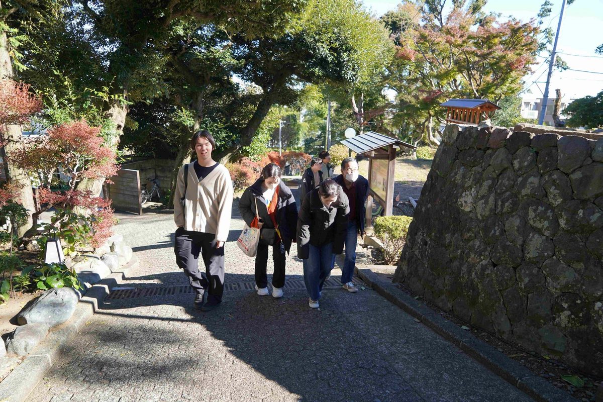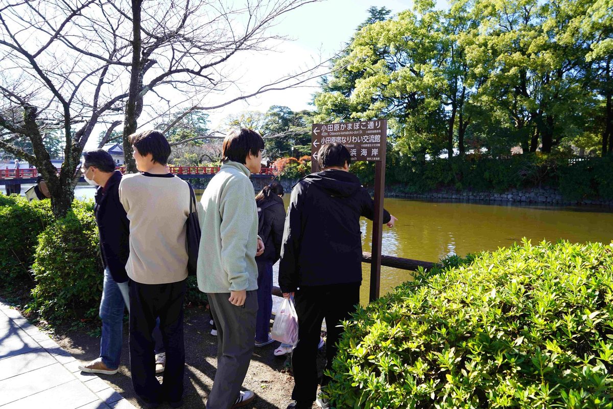 「いせかね」さんを後にしたご一行は、小田原出身の1年生の学生に案内されて小田原城付近を散策しました(写真5、6)。