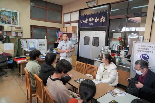 一通り見学が終わると、杉山社長に小田原のかまぼこ産業の歴史とその衰退の過程、さらに新たな試みについて、お話いただきました(写真4)。
