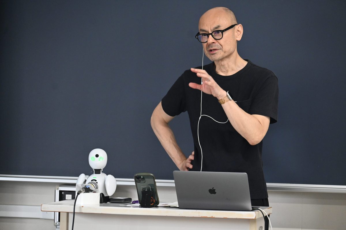 文化社会学部広報メディア学科が5月22日に、湘南キャンパスで分身ロボット「OriHime(オリヒメ)」のパイロットとして活躍する「さえさん」による特別講演会を開催しました。本学科の開講科目「プレゼンテーション実践」の授業の一環として実施したものです。「OriHime」は、株式会社オリィ研究所が開発した遠隔操作型のコミュニケーションロボットで、高さ約20cmと小型ながら首や手のジェスチャーによって人と自然に対話できるよう作られています。パイロットは遠隔地からOriHimeを操作し、離れた場所の人とコミュニケーションを取ることが可能です。「プレゼンテーション実践」では、多彩なテーマのもと、学生同士がグループディスカッションを展開しており、今回の講演会はプレゼンテーションの多様性について理解を深めることを目的としています。