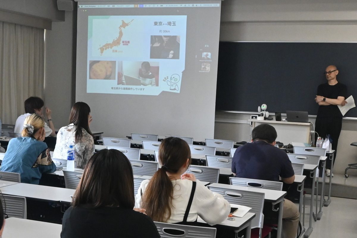 講演では、さえさんが勤務する「分身ロボットカフェ DAWN ver.β」での活動や、自身の経験について紹介。「大学卒業後、半導体の専門商社に就職しましたが、2年ほど経ったころからめまいや吐き気といった体調不良が続くようになり、一人で外出するのが難しくなりました。原因がわからないまま10年が過ぎ、ようやく病院で『身体表現性障害』と診断されました。その後の5年間を含めた15年間は、孤独を感じることも多く、自己肯定感を持てずに過ごしていたことで“消えてしまいたい”と思うこともありました」と振り返りました。「そんな折、SNSでOriHimeのパイロット募集を見かけ、“家からでも働ける”という言葉にひかれて応募しました。私にとって大きな一歩になりました」と話しました。続けて、カフェではおすすめメニューの案内や来店客との会話を楽しんでいるといった勤務の様子のほか、「団子屋での接客や街でのチラシ配布、子ども向けの絵本読み聞かせ、朗読劇や狂言への出演など、さまざまな場所で働いています。夫の社員旅行にも同行させてもらいました」と語り、学生たちからは驚きの声が上がりました。最後に「OriHimeがあれば、障害や見た目に関係なく自然に会話でき、多くの人とつながれるのがうれしい」とまとめました。