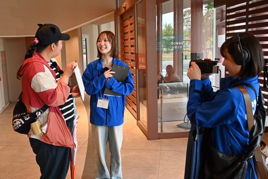 放鳥決定イベントでは、学生6名と野口准教授、樋口教授が2つのグループに分かれて取材。のと里山空港で行われたお笑いコンビ「ココリコ」の田中直樹氏と能登地域放鳥受入推進協議会アドバイザーの小宮輝之氏らによるトークセッションをはじめ、石川県立図書館やいしかわ動物園などで開催された「絵本おはなし会」など、イベントの様子を撮影しました。さらに、トキが生息できる環境づくりに取り組む石川県の職員や、いしかわ動物園トキ飼育繁殖センターの飼育員ら関係者にインタビュー。えさ場環境の整備に関する同県の事業をはじめ、トキの生態や飼育にあたって注意しているポイントなどを質問したほか、イベントの来場者にも、参加した感想やトキ放鳥への期待を聞き取りました。インタビューを担当した北澤心悠さん(3年次生)は、「事前に用意してきた質問に加え、取材相手の回答から話題を広げるような質問をするように心がけました」と話し、撮影を担当した池田ちはるさん(同)は、「被写体の表情を撮影するように意識しました。少しでも多くの人に見てもらえる動画にしたい」と意気込んでいました。
