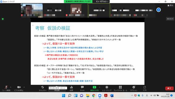 コロナ禍のためオンラインでの発表会になりましたが、先生方がそれぞれのお立場からさまざまなご意見やご感想を語られたり、参加学生が質問をしたりと、時に笑いも交えて和やかな雰囲気で進みました。