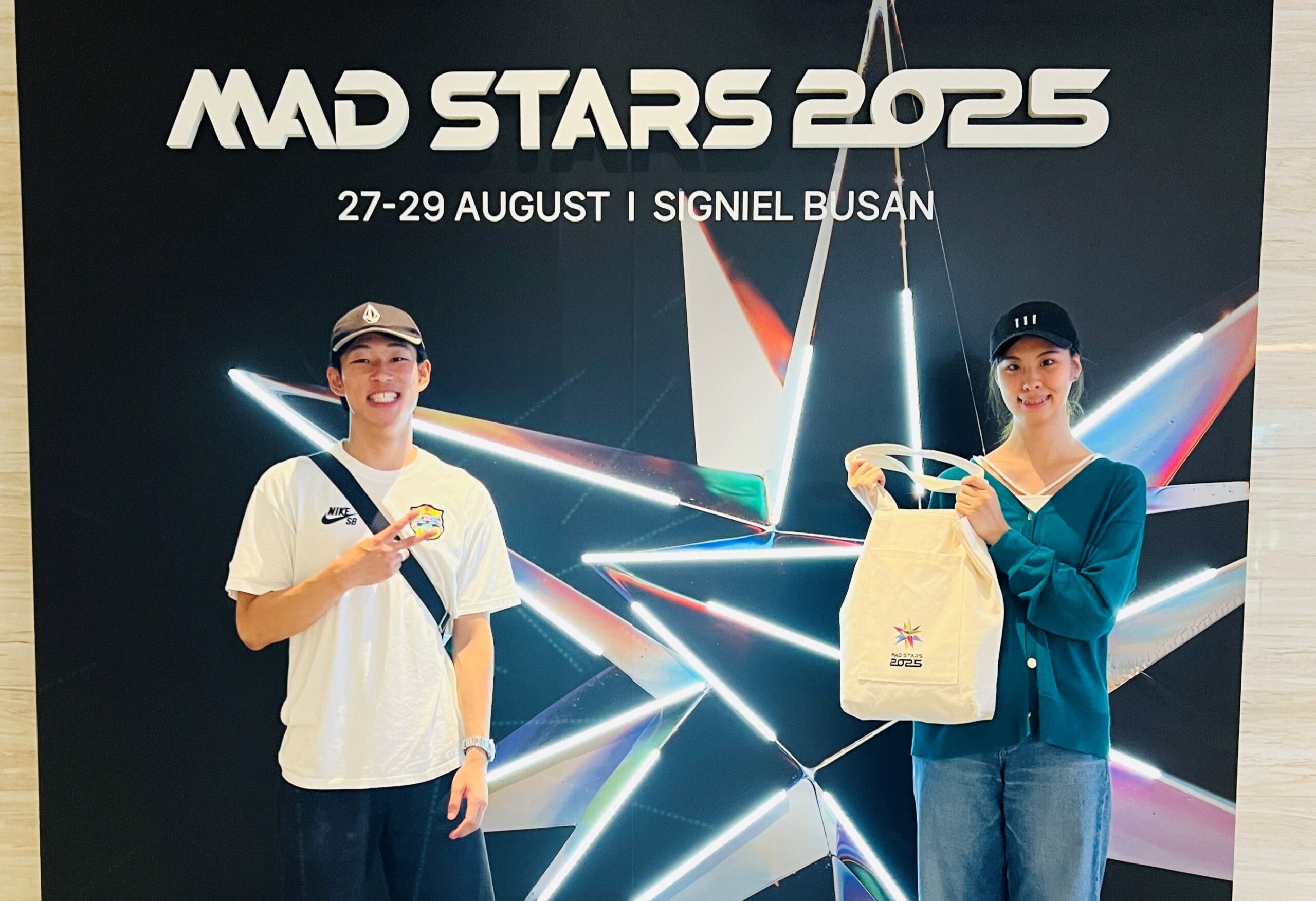 文化社会学部広報メディア学科の福野廉さん(4年次生)と深谷希美さん(3年次生)が、8月27日から29日に韓国・釜山で開催された国際広告祭「MAD STARS 2025」の学生コンペティション部門である「Young Stars」に参加しました。このコンペは、世界的に活躍するクリエーターが発想力や作品を競い合う場で、大学生を対象としたYoung Stars部門を設けているのが特徴です。今大会には、書類審査を通過した各国55チームが参加し、30時間の制限時間内に提示された課題に挑みました。
