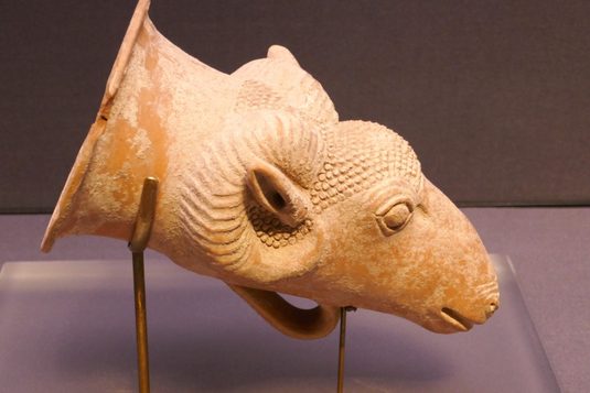 まず、《山羊頭形リュトン》(陶器)を紹介しましょう(写真1)。ギリシャ・ローマ世界では、陶器で様々な動物(牡牛、獅子、ロバ、羊など)の頭部をかたどった、リュトン(角杯)が作られました。リュトンはオリエント起源の金属器が元と考えられています。東京国立博物館の《山羊頭形リュトン》は、アケメネス朝時代(前6~前5世紀)のもので、イラン出土です。なんとも優しいお顔の山羊ですね。