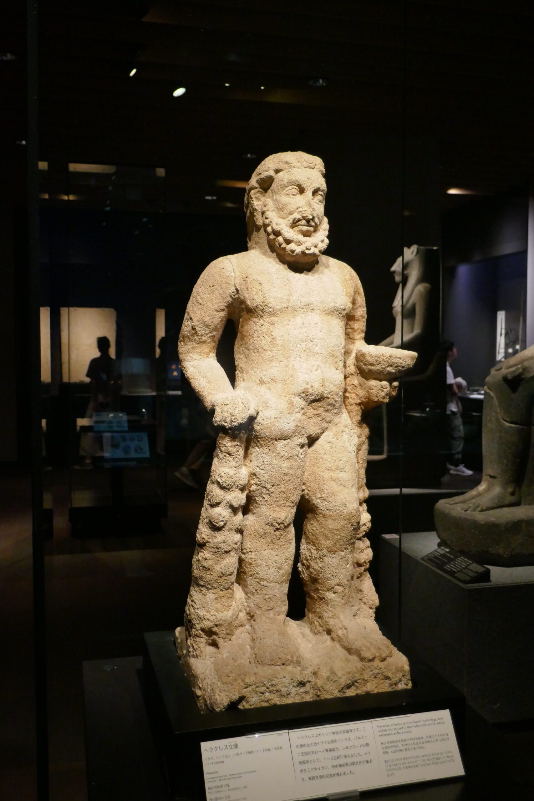 そして、注目したいのが、西アジアのハトラ遺跡(現在のイラク北部)出土の、英雄ヘラクレス像です(写真2)。ヘラクレスといえば、ギリシャ神話に登場する、筋骨隆々とした、怪力の持ち主です。ヘラクレスのイメージはアジアを東斬する過程で、各地の英雄像と重ねあわされ、さまざまなバリエーションが生まれました。