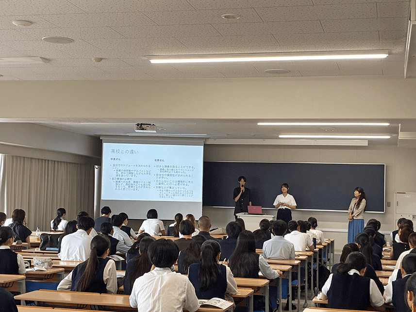 文化社会学部心理・社会学科の学科企画では、前半に本学科のカリキュラムや卒業生の進路などについて教員からお話し、後半は付属高校出身の大学院生と学部生お2人にご協力いただき、本学科の魅力や実際の大学生活の紹介、そして大学生活を充実させるための心構え等についてお話ししてもらいました。来場した高校生は高校1・2年生でしたが、とても関心を持って学生たちの話に耳を傾けていました。