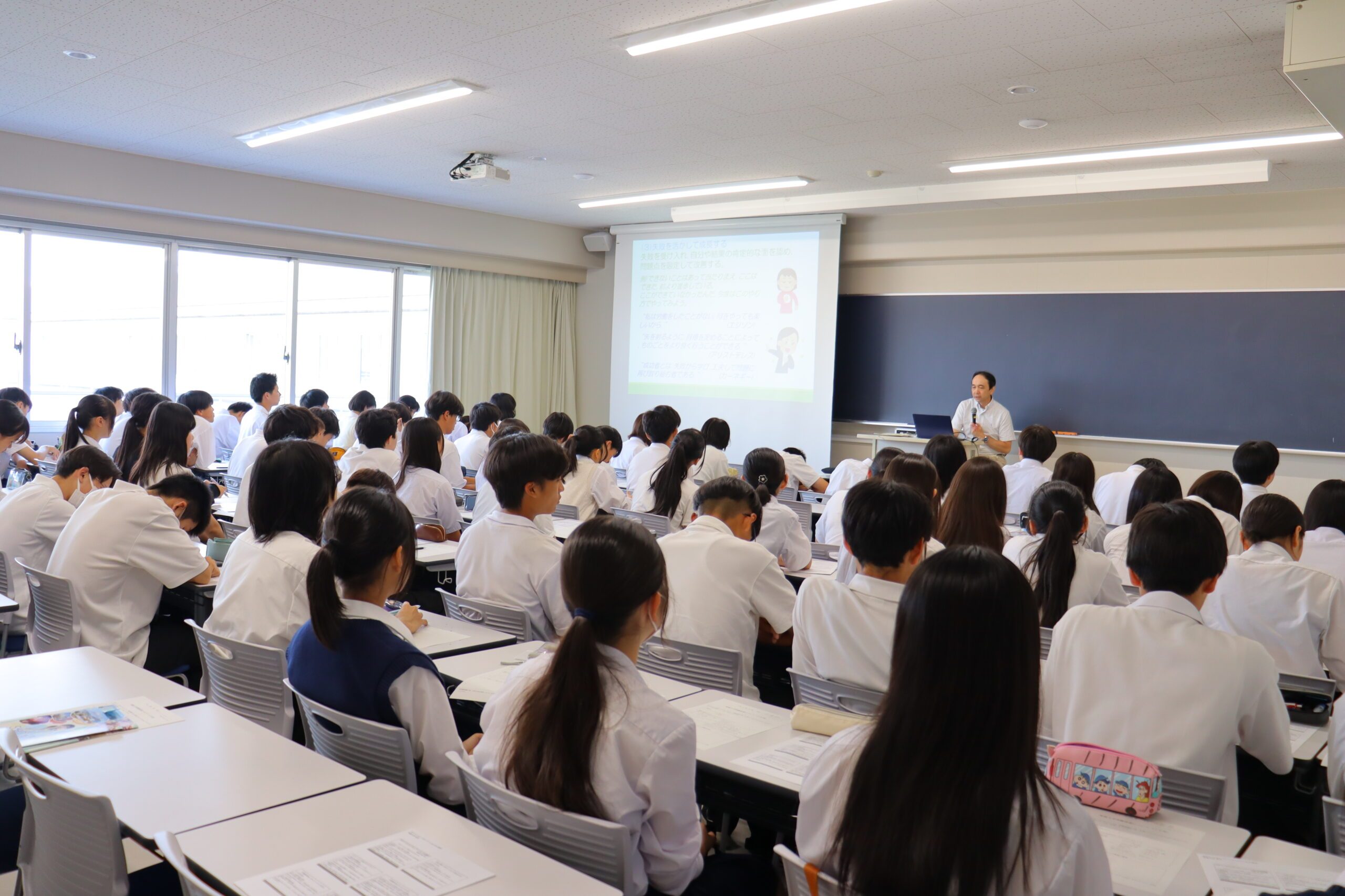 学校生活で、意欲が低い人や高い人、それぞれの心理や行動の特徴、コミュニケーションがうまくとれる人やそうでない人の心理や行動を比較しながら、学業や課外活動に意欲を持って取り組んだり、周囲の人と信頼関係を築くためには、どのような考え方や行動のしかたをすればよいのかについて、お話しました。