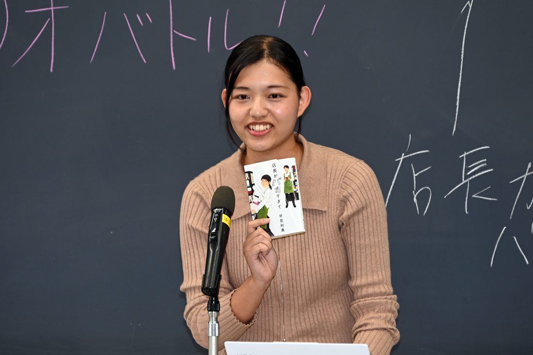 聴衆による投票の結果、チャンプ本には西田さんが紹介した『芸人短歌』が選出。10月25日に帝京大学で開かれる「関東Cブロック決戦大会」への進出を決めました。ここで勝ち抜くと11月23日に長崎県・アルカス佐世保で開催される「全国大学ビブリオバトル in ながさきピース文化祭2025(第16回全国大学ビブリオバトル)」の出場権を獲得できます。西田さんは、「学内大会で優勝できて率直にうれしいです。ゼミで練習を重ねる中で何を伝えるべきか分析し、言葉にした際にどのように伝わるか考えてきた成果を出せました。経験を積んで次の大会でも勝ち抜けるよう頑張りたい」と語りました。また、惜しくもブロック決戦大会への出場を逃した高橋さんは、「自分が面白いと思った本の魅力を伝えられたと思います」と語り、柴﨑さんも「広報メディア学科のラジオプロジェクトで活動しているのでしゃべるのは得意。最後は『本をどれだけ深く読み込めているか』で差がついたと思います。また挑戦したい」と笑顔で語りました。