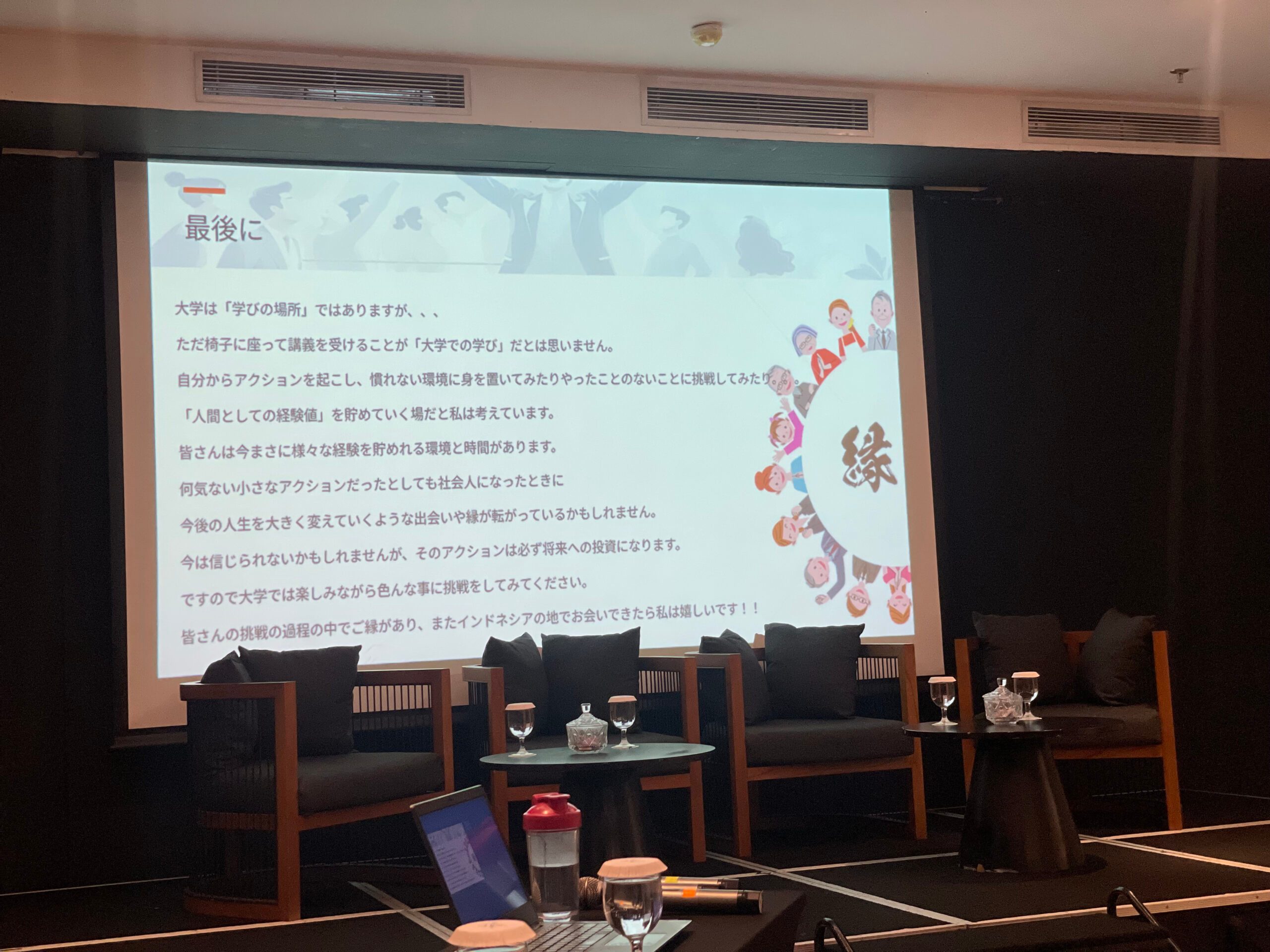 講演では、ジャカルタでの仕事や生活の楽しさについて、達成感の大きさや、海外だからこそ生まれる人とのつながりなどを交えながら、熱く語っていただきました。また、大学時代には、小さなアクションを積み重ねながら、様々なことを楽しんで挑戦することの大切さを、学生たちへのメッセージとして伝えてくださいました。