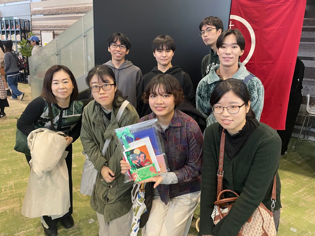 応援にきてくれたゼミ生たちと集合写真(画面中央が西田さん、左端が増田教授)