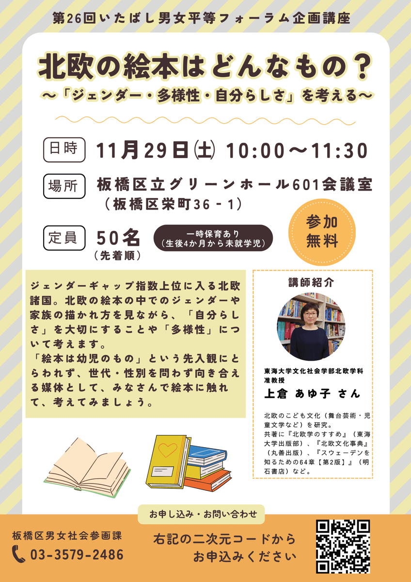 11月29日(土)に開催される「第26回いたばし男女平等フォーラム」にて、北欧学科の上倉あゆ子准教授が、講座「北欧の絵本はどんなもの?〜「ジェンダー・多様性・自分らしさ」を考える〜」にて講師を務めます。北欧の絵本の中でのジェンダーや家族の描かれ方を見ながら、「自分らしさ」を大切にすることや「多様性」について考えます。「絵本は幼児のもの」という先入観にとらわれず、世代・性別を問わず向き合える媒体として絵本に触れて考えてみる講座となっています。ぜひお越しください。
