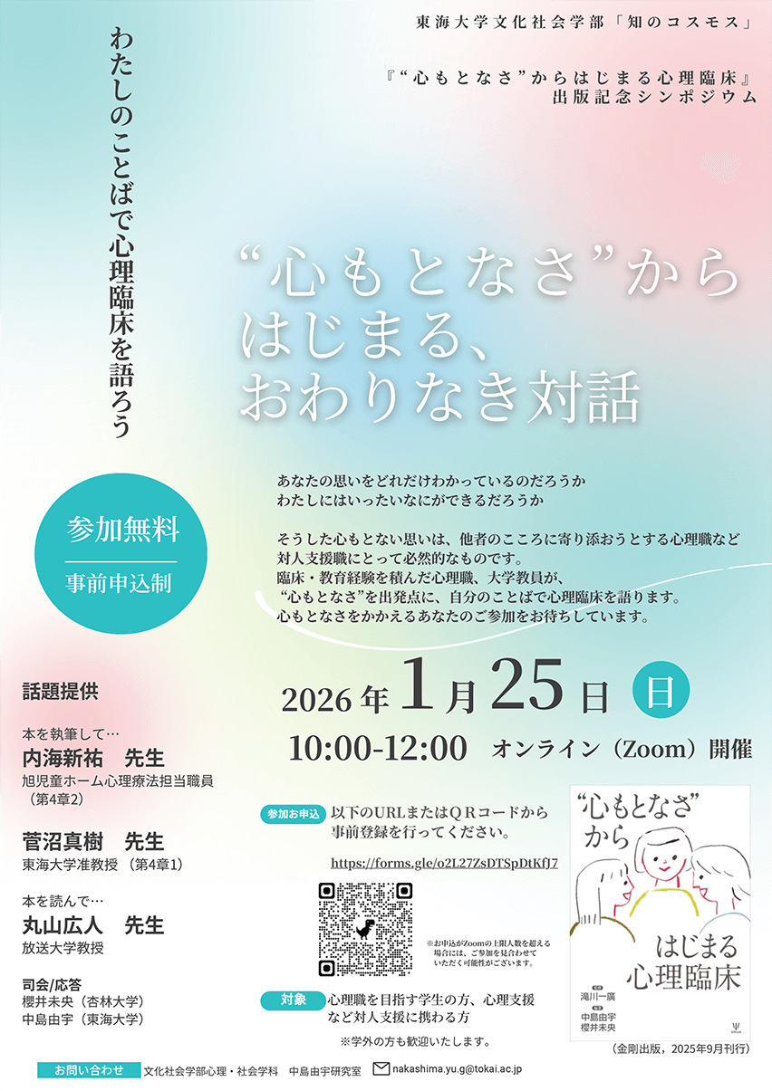 1月25日開催「“心もとなさ”からはじまる、おわりなき対話~わたしのことばで心理臨床を語ろう」文化社会学部「知のコスモス」のご案内