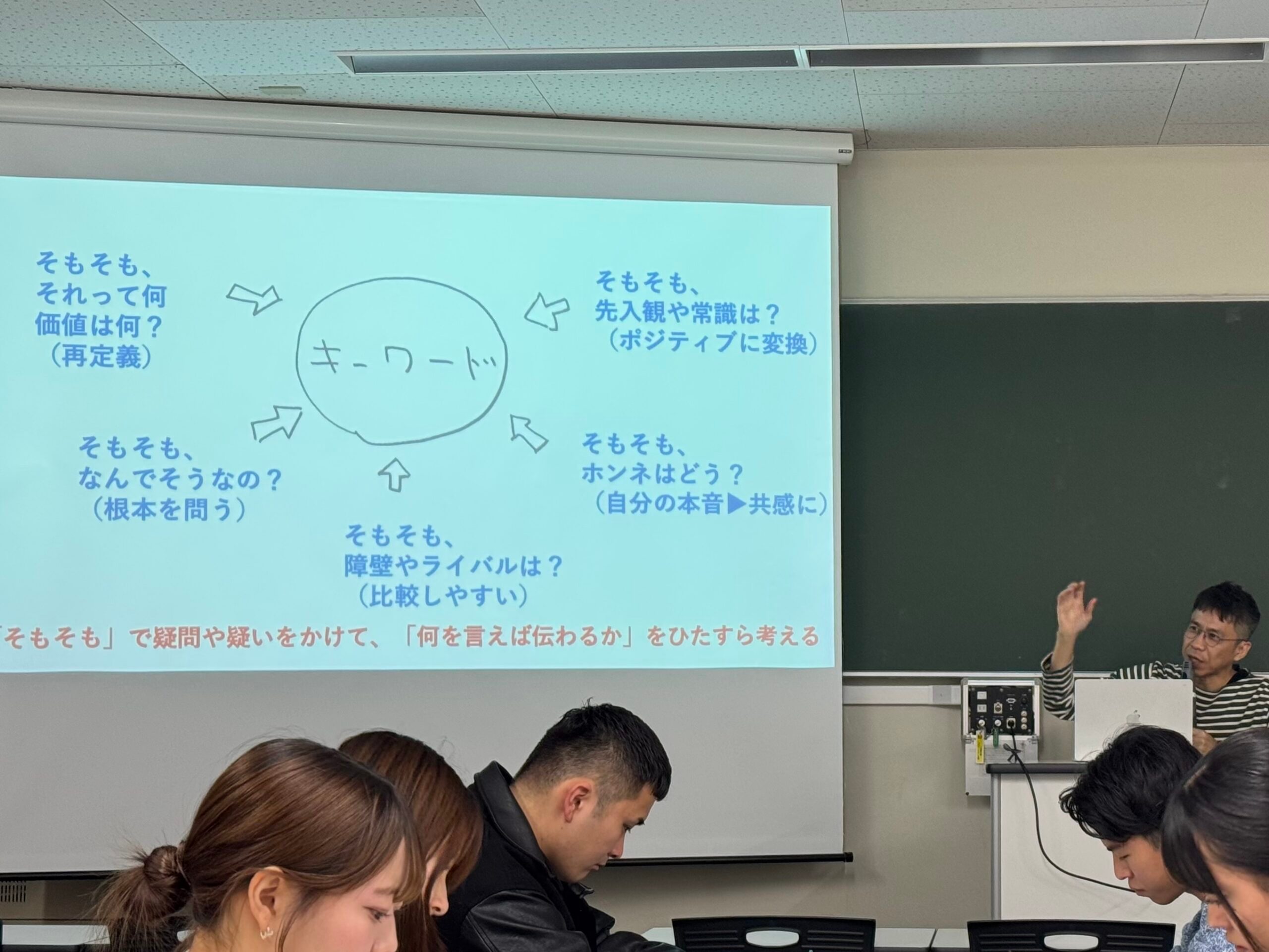 広報メディア学科野口ゼミの学生が、11月27日にクリエイティブディレクターの池端氏をお招きし、キャッチコピー制作のワークショップを行いました。