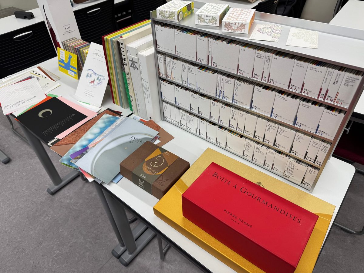 先週には学生たちが竹尾見本帖本店を訪れ、実際にファインペーパーに触れ、その手触りや質感から得た感覚をもとにアイデアを膨らませました。