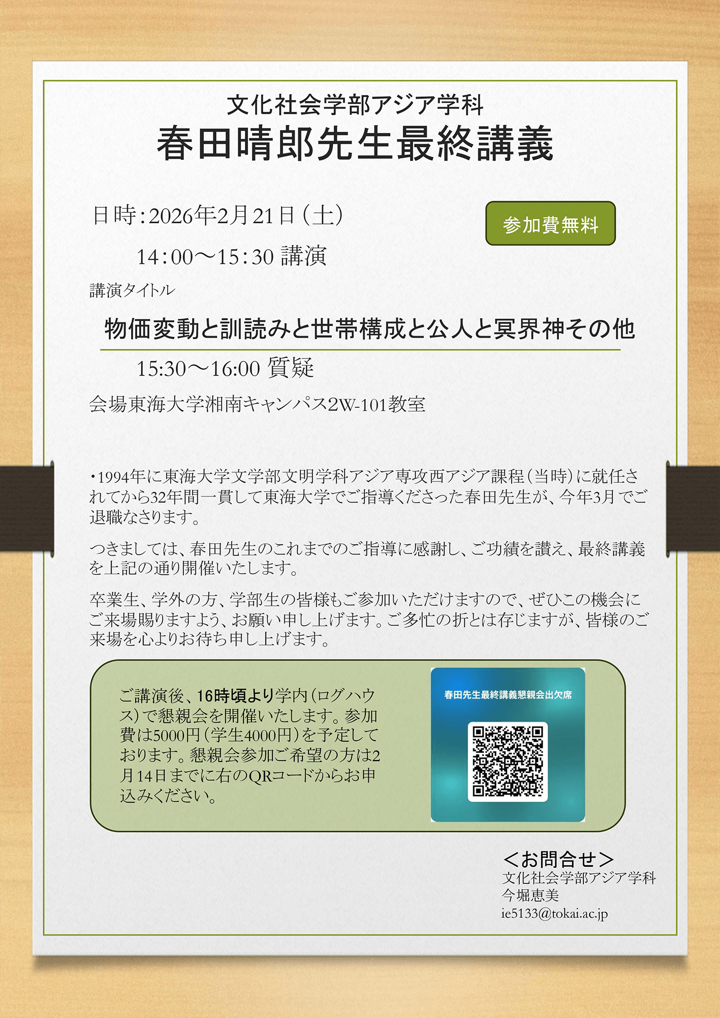 2/21開催 アジア学科 春田教授の最終講義を実施します