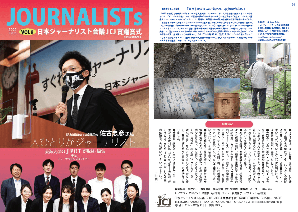 今年度も(昨年9月25日に行われた)「ジャーナリスト会議 JCJ賞贈賞式」に出席し、過去一年に顕著な業績を上げられた受賞者の方々に取材をさせていただきました。その内容をもとに執筆・編集作業を行い、冊子「Journalists (vol.9)」を2022年3月に発行しました。2016年度に1冊目が発行され、JPOTの学生が関わる本誌としては、今回で6冊目となります。