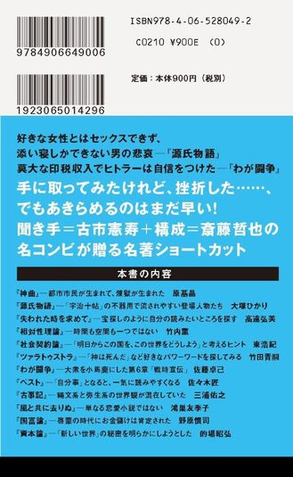 本の内容紹介にはこうあります。「最強の水先案内人がプロに「読みどころ」を聞いてみた――『神曲』『源氏物語』『わが闘争』『資本論』……、名著を読まなくても楽しめる、虫のよいガイド本、誕生!」と。実際、執筆陣は、原先生の他に、プルーストの翻訳者である高遠博美氏や哲学者の東浩紀氏、 鴻巣友季子氏など錚々たるメンバーです。そういった意味では、この本は、新しい世界への門となってくれるかもしれません。原先生は巻頭の『神曲』を担当し、古市さんの質問もあって作品の内容が分かりやすく頭に入ってきます。