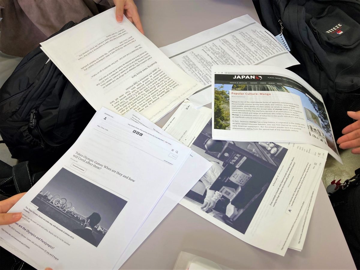 また、グループワークも行っています。5人程度でひとつのグループを作り、一人ひとつずつ英語の文章を調べてきて、グループとして日本語訳を行うテキストを選びます。第1回目は「英語で紹介・報道されている日本のモノ・コト・人」をテーマとしました。写真は、各自が調べてきたテキストの内容を紹介して、グループとしてのテキストを決めている様子です。
