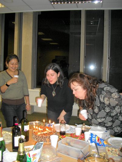 私が社会学部大学院に留学したのは38歳。若いイギリス人ばかりのゼミでひとり年嵩のアジア人、なんてことになったら居づらいなあ、と思っていましたが、それは杞憂でした。ゼミでは(大学院の授業は日本同様、少人数のゼミ形式です)、様々な年齢の、様々な国からの留学生が多く、学部から上がったイギリス人学生の方がむしろ少数派。写真は教室を借りて40代を過ぎた友人の誕生日パーティの様子ですが、イギリス人は彼女を含め二人だけ。中央アジア・キルギス出身、南米・チリ出身の友人がケーキにろうそくを立て、私は仲良しの香港出身で当時21歳のヴィエンと一緒に切り分けられたケーキを食べました。