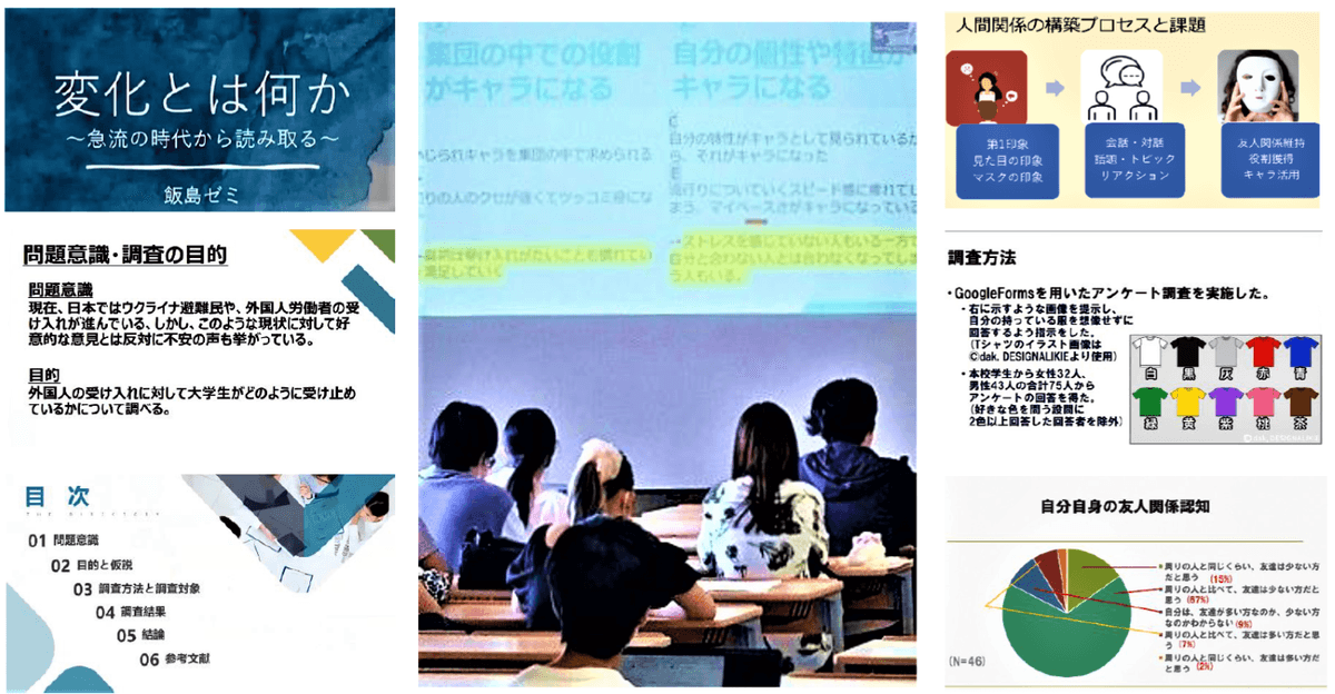 今回発表されたワークショップのテーマを見ると、「記憶と服飾に関する色の心理効果」「大学生の友人関係に関する対人意識」「大学生の友人関係構築と情報収集におけるSNSの使い分け」「大学生における『メンタルヘルス・スラング』」「対人魅力~男性の外見的魅力~」「思いやりのある嘘」「Z世代の時間と意識」「変化とは何か~急流の時代から読み取る~」「移民の受け入れへの態度の比較と今後の社会の展望について」など、個人の心理から社会問題まで多彩な問題関心や領域にわたっています。