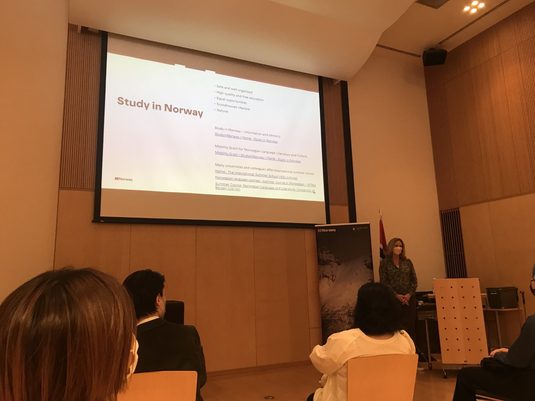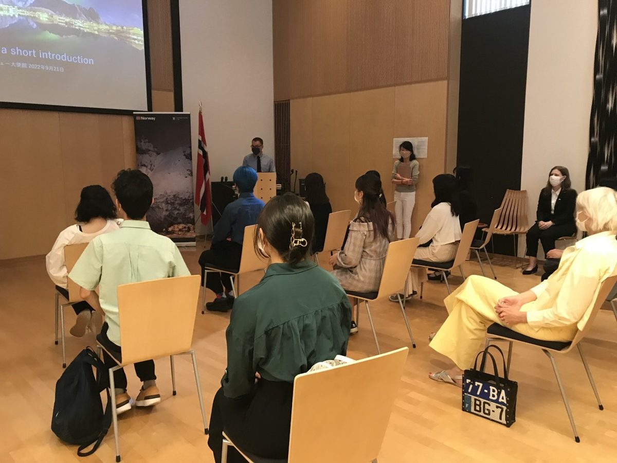 大使館では、教育や政治、SDGsの取り組み、多様性を重んじる社会など、ノルウェーについての包括的な内容をマルムグレン文化参事官からお話しいただき、続いてベルグ科学技術・高等教育参事官から、ノルウェー留学の仕組みについてお話を伺いました。