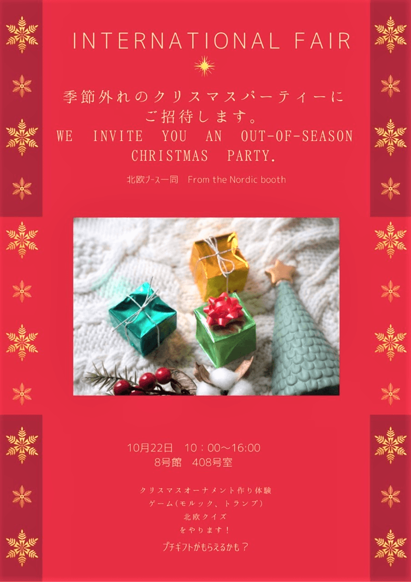 10月22日(土)開催の国際フェア(グローカルフェスタ)に北欧研究サークルFINDSと留学生を中心とした2つの団体が共同で「北欧ブース」を出展します。テーマは「クリスマス」。クリスマスオーナメント作り(ユールヤータ、ヒンメリ)、ゲーム(モルック、トランプゲーム)、北欧クイズを実施します。デンマーク、ノルウェー、フィンランドからの留学生も参加します。ぜひお越しください。