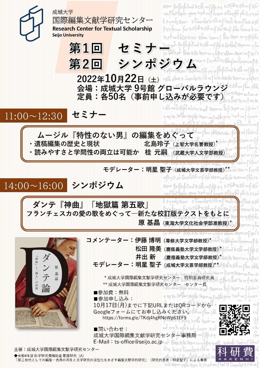 10月22日(土)、ヨーロッパ・アメリカ学科の原先生が、成城大学国際編集文献学研究センターで開催されたシンポジウムで、「ダンテ『神曲』「地獄篇 第五歌」フランチェスカの愛の歌をめぐって-新たな校訂版テクストをもとに」と題した講演を行いました。質疑応答では一般の方から大学院生、そしてさまざまな分野を代表する研究者らを交えて、最先端のダンテ研究をめぐる活発な議論が行われました。