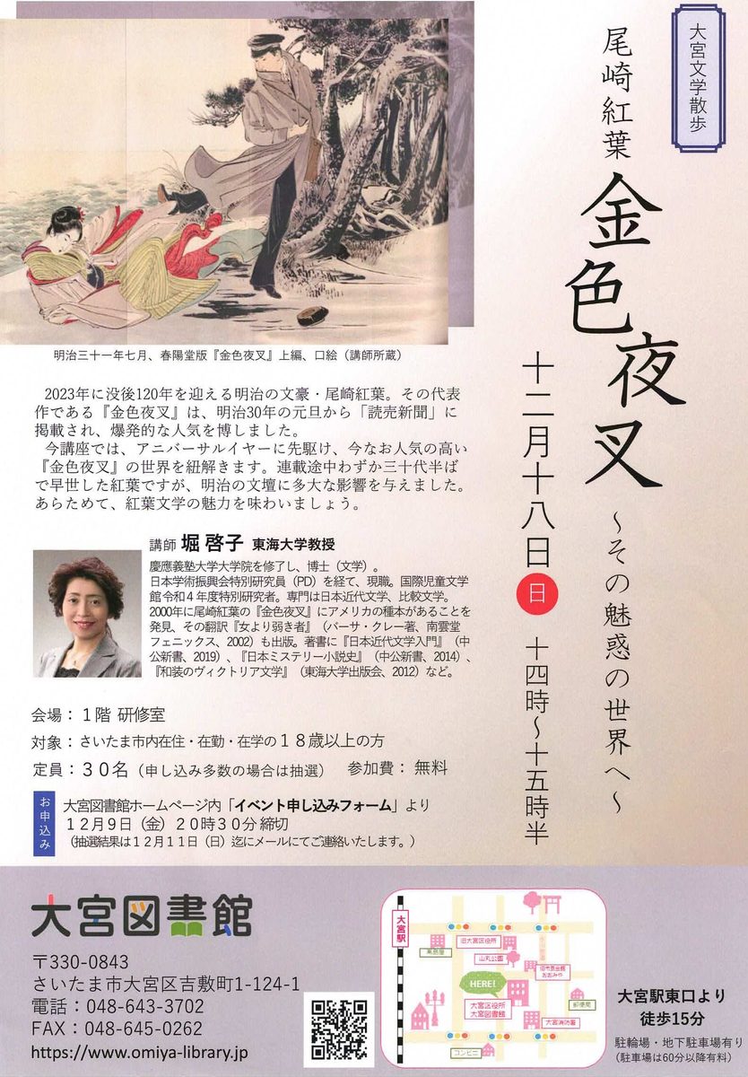 文芸創作学科の堀啓子先生が、12月18日(日)さいたま市の大宮図書館で「尾崎紅葉 金色夜叉~その魅惑の世界へ」と題して講演されます。