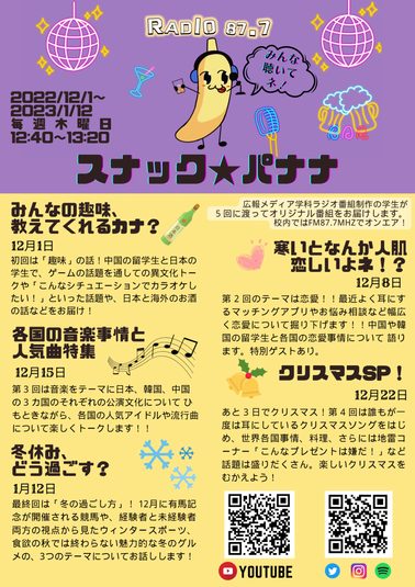 「スナック・パナナ」は、FMパナナ(87.7MHz)という特設臨時放送局(校内放送)から、広報メディア学科の授業「ラジオ番組制作」を履修する学生が全5回を制作し、放送するものです。