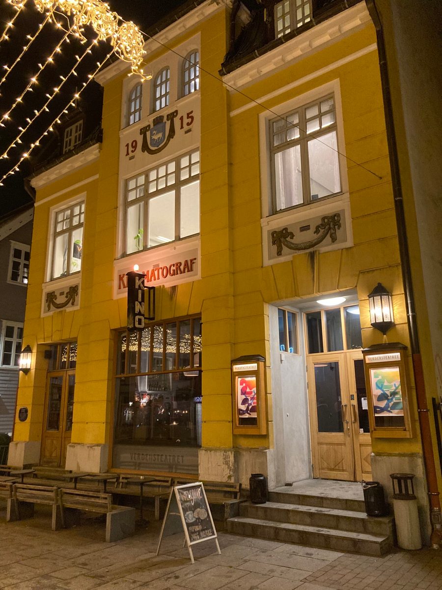 トロムソ市(Tromsø)はノルウェー北部地方の中心都市で人口は約7万人です。トロムソには1916年6月に開館したノルウェー最古の映画館「バーデンス劇場(Verdensteatret)」があります。市の中心部を通るメインストリート沿いにあり、座席数は216席で、現在も映画館として営業を続けています。館内の壁画は開館当時のものが残されています。映画館に入ってすぐのホールにはカフェ兼バーがあり、そこで購入したコーヒーやビールを館内に持ち込んで映画を楽しむことができます。上映後には映画を観た人たちで満席になる賑わいです。