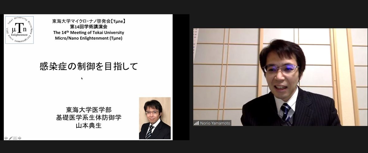 開会にあたり、世話人を務めた医学部医学科の中川草講師(基礎医学系分子生命科学)が開催の趣旨や企画の意図を説明し、「双方向で語り合えるさまざまなツールを準備しました。ぜひ活発にディスカッションし、交流を深めてください」とあいさつしました。前半の招待講演では、医学部医学科の教員2人が、それぞれの研究成果を紹介。山本典生教授(基礎医学系生体防御学)は「感染症の制御を目指して」と題して、国立感染症研究所などで携わったインフルエンザワクチンの早期開発・製造システムの構築や、SARS(重症急性呼吸器症候群)コロナウイルスに関する研究成果について説明しました。また、新型コロナウイルス感染症の候補薬のスクリーニング結果や、高度な安全機能を備えた実験施設の整備状況についても解説し、「感染症を制御するための戦略の確立に向けて、お互いの強みを生かした共同研究ができればうれしく思います」と語りました。