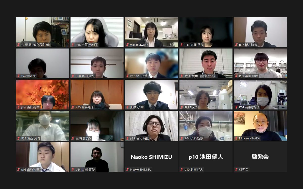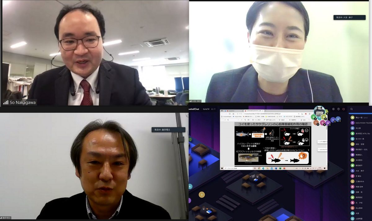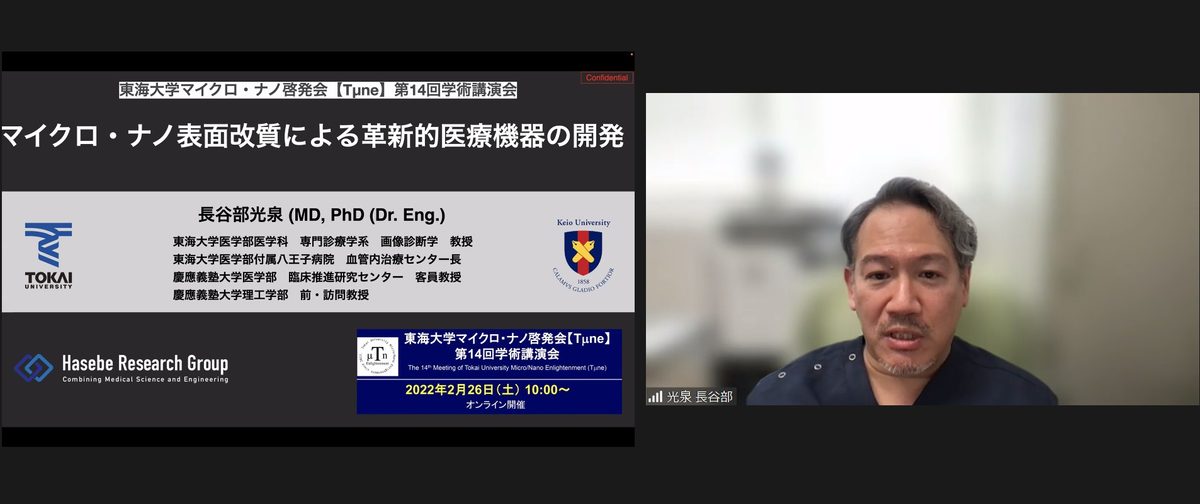 東海大学マイクロ・ナノ啓発会【Tμne】第14回学術講演会を、2月26日にオンラインで開催しました。総合大学のメリットを生かした研究の情報交換やコラボレーションを目指し、マイクロ・ナノ研究開発センター(MNTC)に所属する教員が中心となって開いているものです。今回は招待講演やテクノロジーセミナーに加え、初めてワールドカフェ形式(活発で創造的な対話ができるよう、リラックスした雰囲気でメンバーを変えながら行うグループセッション)によるショートプレゼンテーションや、オンラインミーティングツール「SpatialChat」を用いた意見交換会も実施。本学の理学部や工学部、医学部、生物学部の学生や大学院生、教員をはじめ、大阪大学の学生や教員ら約110名が参加しました。