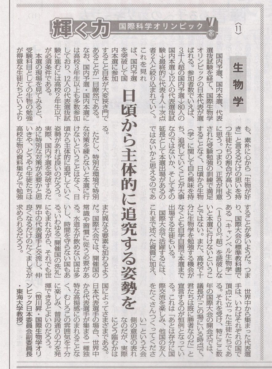 工学部生物工学科の笹川昇教授は、国際生物学オリンピック日本委員会(Japan Biology Olympiad Committee)副委員長を務めており、これまで10年以上にわたって代表選手の選出や指導・大会引率を行ってきました。今回、日本教育新聞から国際生物学オリンピックに関して解説を求められ、6月26日付で同紙記事として掲載されました。国内予選を突破する選手たちの様子や、国際大会に出場した日本代表選手の活躍について、実際の体験に基づいた臨場感あふれる内容になっています。笹川教授は『理系の興味について大学と高校との間に線引きを行う必要はなく、興味さえあれば自由に実験や探求できる環境が望ましいと思います。この活動は高大連携のひとつの事例として捉えることも出来るのではないかと考えています』と話しています。