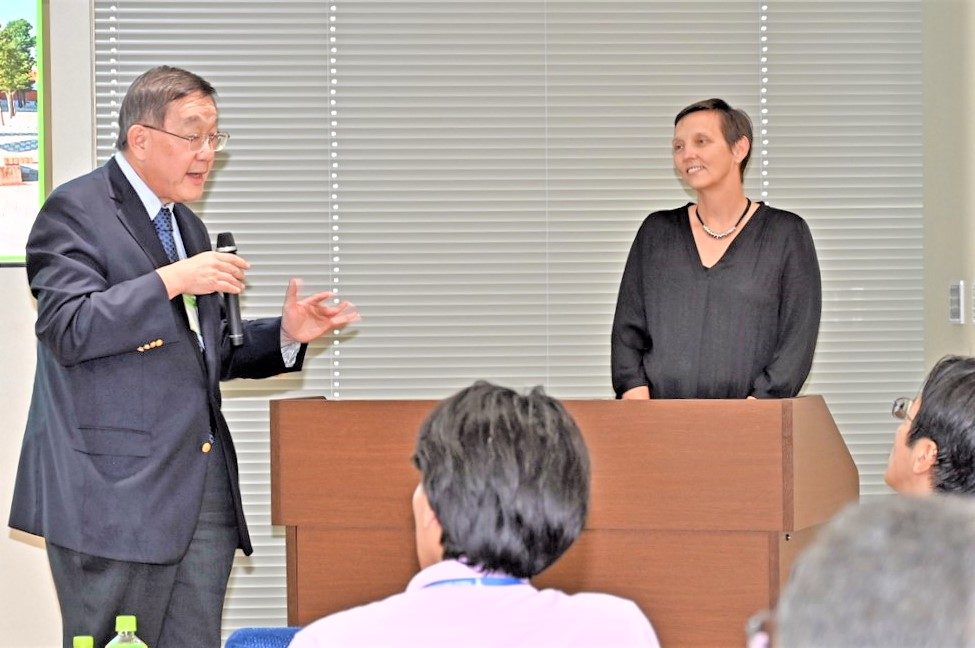 初めに梶井龍太郎学長代理が、「新たな分野で日本をリードする、世界に負けない研究を展開したいと考えています。ぜひご協力をお願いします」とあいさつ。続いて、稲津敏行副学長(理系担当)が次世代研究創成拠点の概要や今後の展開について紹介し、「災害医療や材料科学、スポーツ医学、衛星情報など、新しい拠点となり得る研究が進んでいます。学園の創立者・松前重義博士が訴えた“技術の社会還元”の考えを受け継ぎ、創立100周年に向けて、研究の充実・支援と実用化、人材育成に全力で取り組みます」と語りました。