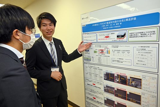 初日のポスター発表には、本学から大学院工学研究科の大学院生3名が参加しました。井出岳さん(2年次生)は、「熱CVD法によるCNT合成における二層触媒金属の組織解析」をテーマに発表しました。自動車などに用いられるワイヤーハーネス等への応用を目指して、カーボンナノチューブ(CNT)を糸状に加工する際に二層触媒金属を使用し、触媒の粒径や形状、元素分析を行った成果を発表しました。「このような場での研究発表は初めてで、参加者の皆さんと議論する中で新しい知見を得られるとともに、自分の研究の方向性が見えてきました」と充実の表情を見せていました。「AlN基板上でのCNT垂直配向膜の合成と構造評価」と題した研究を発表した菊地詩音さん(同)は、ノートパソコンやスマートフォンなどの小型電子機器の熱制御に使われているグラファイトシートの垂直方向の熱伝導性が低いという課題を解決するために、CNTを使用できないか検討。「CNTを活用できれば処理速度がアップし、製品も長持ちするようになります。発表は初日のみですが、講演や他の方たちの発表を聞いて最新の技術を学び知見を広げるのが楽しみです」と期待を語りました。また、CNTを糸状に撚って加熱処理を加え、構造評価を行い、「異なる紡績条件で作製したCNT糸の機械的性質と熱処理効果の検討」と題して発表した岡田環さん(1年次生)は、「まだまだ強度にバラつきがありますが、加熱処理で一定の強度を保証できればさまざまな製品に応用できるようになります。聞きに来てくださった方々との会話はとても有意義で、今後につながるアドバイスもいただきました」と話していました。