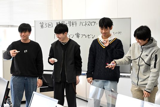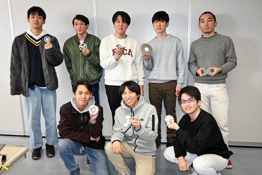 工学部精密工学科では1月17日に湘南キャンパスで、「第3回精密工学科ハンドスピナー選手権」を開催しました。製図の方法から実際の作品が完成するまでを体験してほしいと、窪田紘明講師(機械工学科)が担当する3年次生の授業「精密システムデザイン」の一環で企画したものです。履修学生たちは中央のベアリング部分を2本の指で持って回転させる「ハンドスピナー」のデザイン案を考え、人間工学や流体力学、機械力学などの知識を生かして改良を重ねてきました。株式会社JMCのオンライン見学会なども通して学びを深め、学生の設計データに沿って同社が3Dプリンターで部品を制作。学生たちは重りをつけたり、色を塗ったりして完成させました。