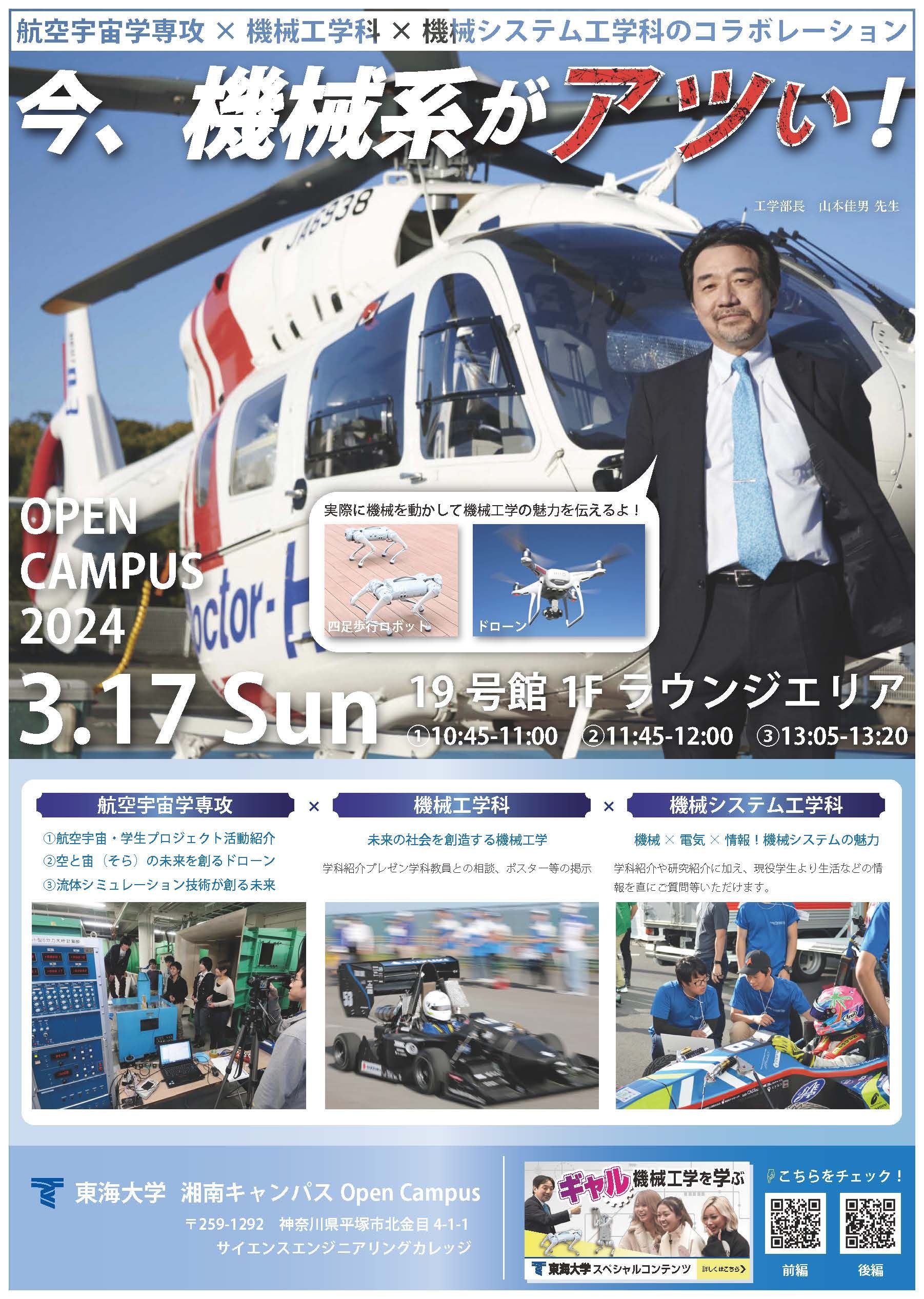 2024年3月17日(日)にオープンキャンパスが開催されました。サイエンス・エンジニアリングカレッジでは、航空宇宙学科航空宇宙学専攻、機械工学科、機械システム工学科の3学科コラボによる機械系のイベントを行いました。ご参加いただいたみなさまには、工学部長の山本佳男教授による<機械系の魅力を伝えるショー>の後に各学科企画を見学いただきました。3学科の企画に多いに興味を持っていただき、大盛況のうちに終了いたしました!