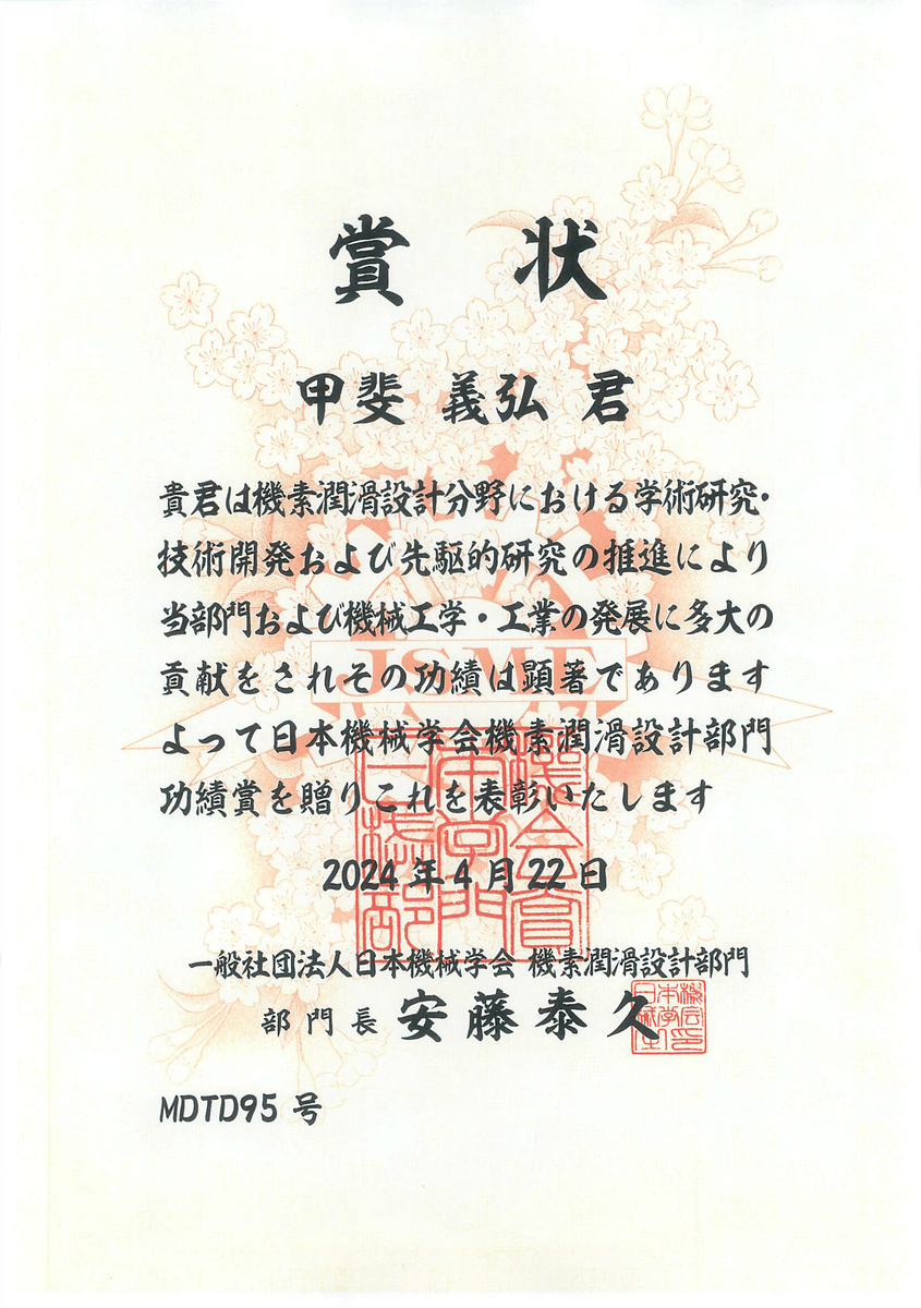 先日(2024年4月22日に)、機械システム工学科の甲斐教授が「一般社団法人 日本機械学会 機素潤滑設計部門 功績賞」を受賞されました。
