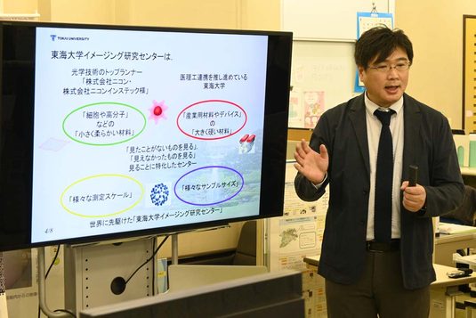 湘南キャンパスのイメージング研究センターで昨年12月14日に、秦野市立西中学校の科学部に所属する生徒たちを対象に、「見て・測って・知って何が見えるか体験会」を実施しました。理科に興味のある中学生たちに、本センターの機器や研究に触れることで自身の興味や疑問を深め、考えるきっかけにしてもらおうと企画したものです。当日は、1年から3年までの生徒10名が参加。初めに、工学部機械工学科の槌谷和義教授が本センターの設立経緯や機器の概要、自身が手掛けた“蚊を模倣した”痛くない注射針(マイクロ無痛針)の開発事例から最新機器の活用について講義しました。