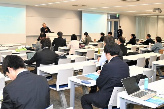 続いて、横浜国立大学研究推進機構特任助教(URA)の松浦かんな氏による「オープンサイエンス時代の研究活動のNew Normal」をテーマとしたランチョンセミナーを実施。2025年度から新たに公募される競争的研究費の一部では、受給者に対して研究成果の即時公開が義務付けられることから、松浦氏は適切な研究成果の管理方法やデータの利活用について具体的な事例を交えて解説しました。また、学長室部長の濱本和彦教授(情報理工学部)より、本学が採択された文部科学省「オープンアクセス加速化事業」の支援を受けて実施した学術論文のAPC支援、転換契約の推進、研究データの管理・利活用のためのシステム構築などについて説明を行いました。並行して開催した企業懇談会には、41機関から70名が参加。梶井龍太郎学長代理があいさつに立ち、本学からは総合科学技術研究所の岩森暁所長(工学部教授)や木村英樹学長補佐(同)をはじめ、理工系学部の学部長や研究科長、研究所長らが出席し、参加者と交流を深めました。