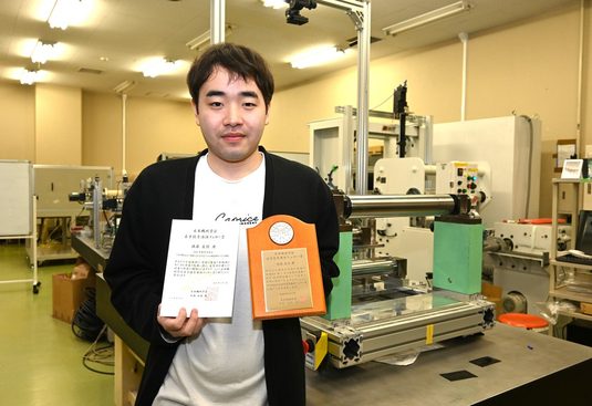 大学院工学研究科修士1年次生の後藤宏弥さん(指導教員=工学部機械システム工学科・砂見雄太准教授)が、昨年9月に愛媛大学で開催された日本機械学会2024年度年次大会で若手優秀講演フェロー賞を受賞。3月3、4日に山口大学で開かれた日本機械学会情報・知能・精密機器部門講演会(IIP)で表彰式が行われ、賞状と盾が授与されました。同賞は同学会主催の講演会参加者の中から、研究内容の新規性が高く発表態度に優れた若手研究者に贈られるものです。