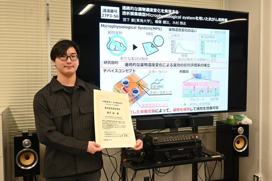 木村教授は、「学部3年次生の後期からMPSの開発や実験に取り組んできた宮下さんは、持ち前の粘り強さとこだわりで材料が違うもの同士を接着する技術などのノウハウを蓄積してきました。装置の設計にも秀でており、シンプルで無駄がない上に、見た目も良いデバイスを作ってくれます」と評価します。宮下さんは、「バイオ系ばかりではなく機械系の研究者もいる発表の場では、細胞や薬物についてより丁寧な説明を心がけるなど、経験を積んで徐々に内容をブラッシュしてきました。今回が初めての受賞ですが、自分なりにその時の最高点を目指して妥協せずにやってきたと思います。まずは、この研究内容を博士論文として社会に対して発表できるように頑張り、今後は機械系とバイオ系の融合を手がけてきた経験を生かし、ジャンルを問わず新しい分野に対しても惜しみなく進んでいきたい」と語っています。
