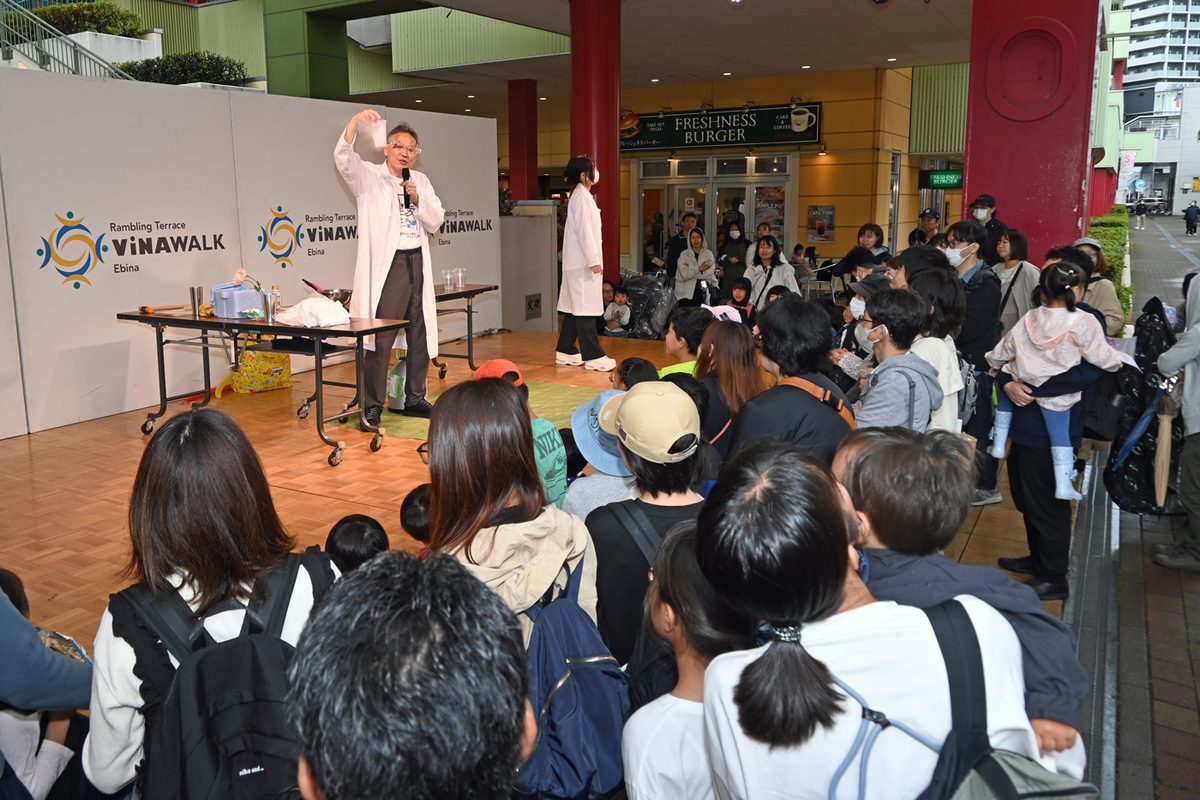 当日は、「ドクターアキヤマサイエンスショー」と題して液体窒素を使った実験を披露。液体窒素に風船や花、バナナなどを入れて状態の変化を観察する実験を行いました。会場内の各ブースでは、「理科教育ボランティア」の授業を履修する学生を中心とした約30名が運営をサポート。洗濯のりや高吸水性ポリマーなど身近な材料を使ってスライムや人工雪、入浴剤、スーパーボールを作るブース、巨大空気砲など約10種類の体験ブースを出展しました。あいにくの雨でしたが、会場は約400組の来場者でにぎわいました。参加した子どもたちは、「雪もスライムもきれいな色にできて面白かった」「好きな香りで作った入浴剤でお風呂に入るのが楽しみ」と感想を話していました。また、湘南キャンパスで活動する「ダンス部MDC」もパフォーマンスを披露し、イベントを盛り上げました。ビナウォークの担当者は、「海老名市には大学がなく、大学とのコラボレーション企画も初めてでした。今回のイベントをきっかけに多くの方が来場してくれてありがたいです。今後も連携を深めていけたら」と話していました。