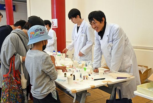サイエンスショーをサポートした片渕亜美さん(工学部3年次生)は、「子どもたちには、化学反応の仕組みを少しでも自分で考えて答えに気づいてもらいたいので、“この色とこの色が合わさったら何色になるかな?”などと質問を問いかけながら話すことを心がけました。子どもたちの反応もよく、とてもうれしかったです」と笑顔を見せました。秋山教授は、「あいにくの悪天候でしたが、このイベントを目当てに来場してくれた方も多く、改めて子ども向けの理科イベントの需要を感じました。また、本学科の学生の中には、小学生の時に私が実演したサイエンスショーをきっかけに理科を好きになったという人もいます。今後も子どもたちが理科に興味を持ってもらえるイベントを開いていきたい」と語りました。
