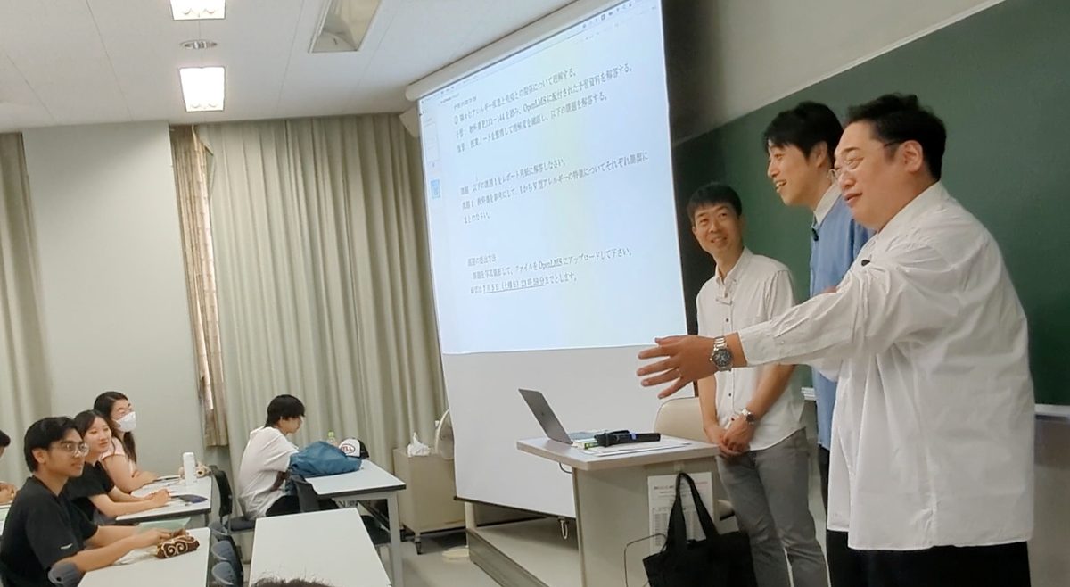 午前中はまず、3年生向けの講義「免疫学」(担当:黒田 泰弘 准教授)に三拍子さんが“突撃取材”。「免疫の授業の面白さは何ですか?」という三拍子さんからの質問に、黒田准教授は「風邪をひいたときに飲む薬や食事の効能など、身の回りの現象の理解が深まることです」と答えていました。次に訪れたのは、1年生向けの講義「基礎化学」(担当:川本 諭一郎 准教授)。階段状の大教室で行われているこちらの講義では、三拍子さんも学生さんに混ざって着席して授業に参加。「質問があります!」と挙手し、「川本先生の講義はわかりやすいですか?時々ギャグを言ったりしますか?」と問いかけ、学生さんたちを笑わせていました。