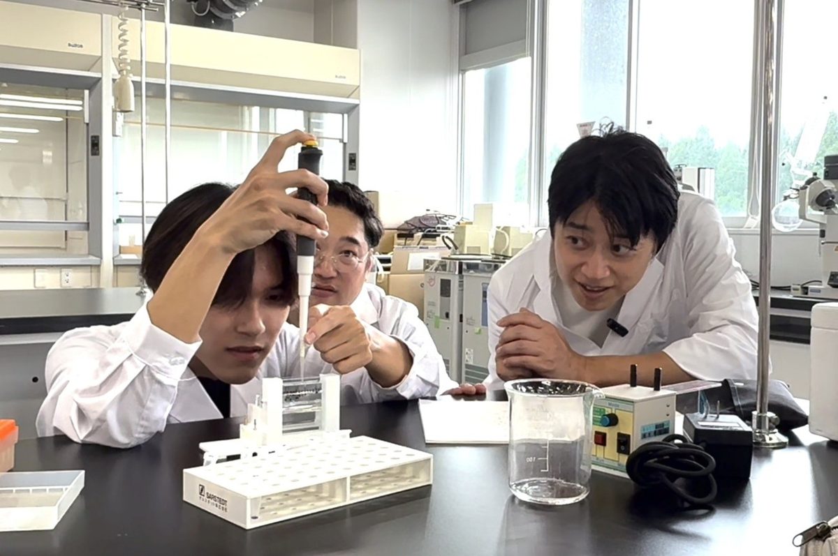 午後は、マイクロ・ナノデバイス技術を活用して、マイクロメートル(1 mmの1/1000の長さ)単位の小さな空間で細胞を培養して生命現象の解明に取り組んでいる木村 啓志 教授の研究室を訪問。研究室に所属して集中的に実験に取り組む4年生や大学院生に、研究の目的や意義、面白さをインタビューしました。学生さんからは、「大学入学時には全く知らなかった研究テーマだけど、生物工学科で出会って面白いと思った」という声が聞かれました。最後は、白衣を着用して、2年生の「生化学実習」(担当:高橋 哲夫 准教授、笹川 昇 教授、島 亜衣 講師)に参加。実習科目では講義で学んだ知識を実際に体験し、技術を身に着けることを目指します。この日は、タンパク質を大きさによって選り分けるSDS-PAGEと呼ばれる実験技術の実践でした。班ごとに協力して、マイクロピペットを使ったサンプルの調製や実験装置の組み立てに取り組む学生さんたちを見た三拍子さんからは、「活気があって皆さん楽しそうですね!」との感想をいただきました。